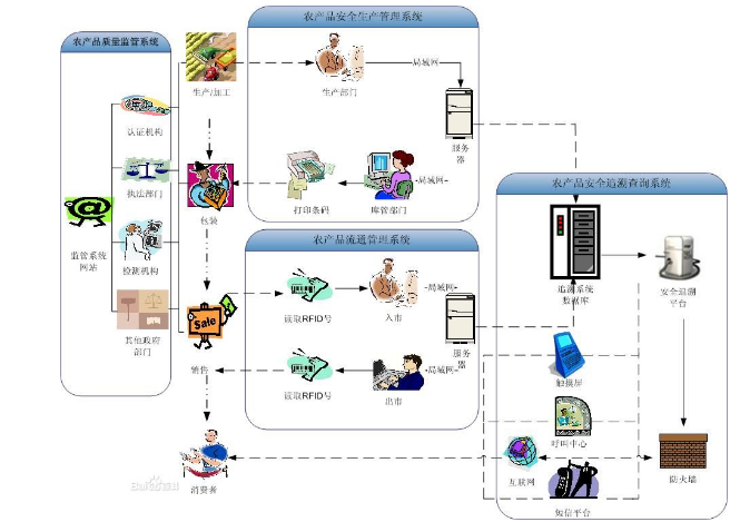 农产品质量管理系统,通过固定式专用RFID阅读器自动识别个体,进行自动分拣归栏,自动饲喂、自动追踪记录活动规律、饲养数据等,监控农产品(生猪)生长密度、环境参数,通过网络实时更新到档案数据库。进而通过RFID或条形码管理系统实现物流的追溯(通过包装条码查询产品物流状态)和产品质量的追溯(查询此批次产品的相关质量数据),为客户提供产品增值服务,同时也为企业生产管理者提供一手的现场数据。