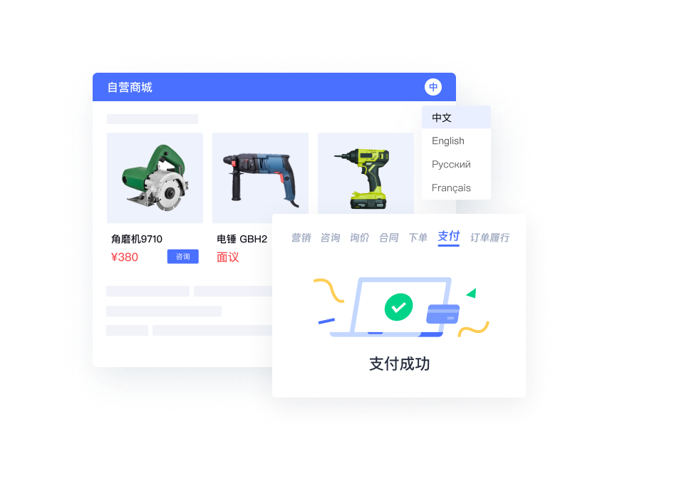 商品信息、在线询价管理、订单管理、支付管理、电子合同、评价体系等全流程数字化管理, 简化供采双方交易路径与实现交易智能化,帮助企业建立B2B供应链交易闭环系统。